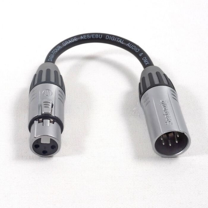 DMX adapter cable to convert 3pin Female XLR connectors to 5pin Male XLR connectors, for use with DMX lighting and data transfer.